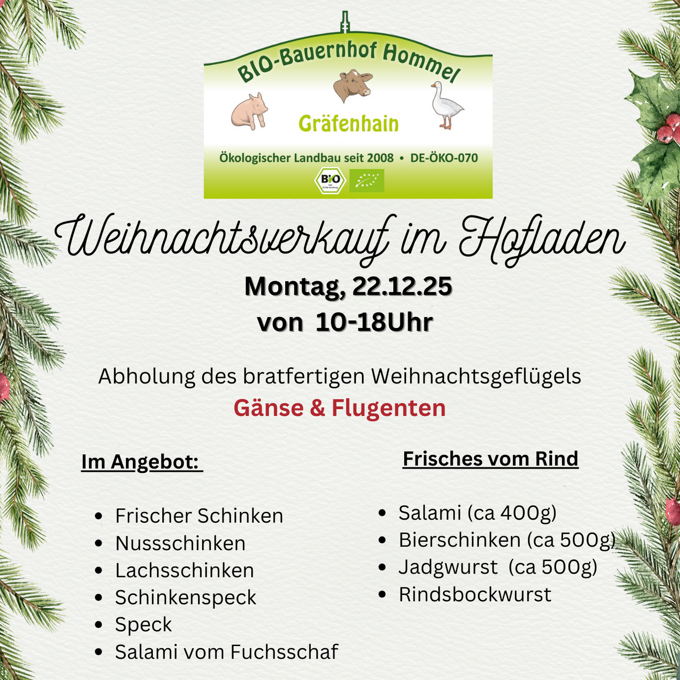 Verkäufe im Hofladen und bevorstehende Veranstaltungen